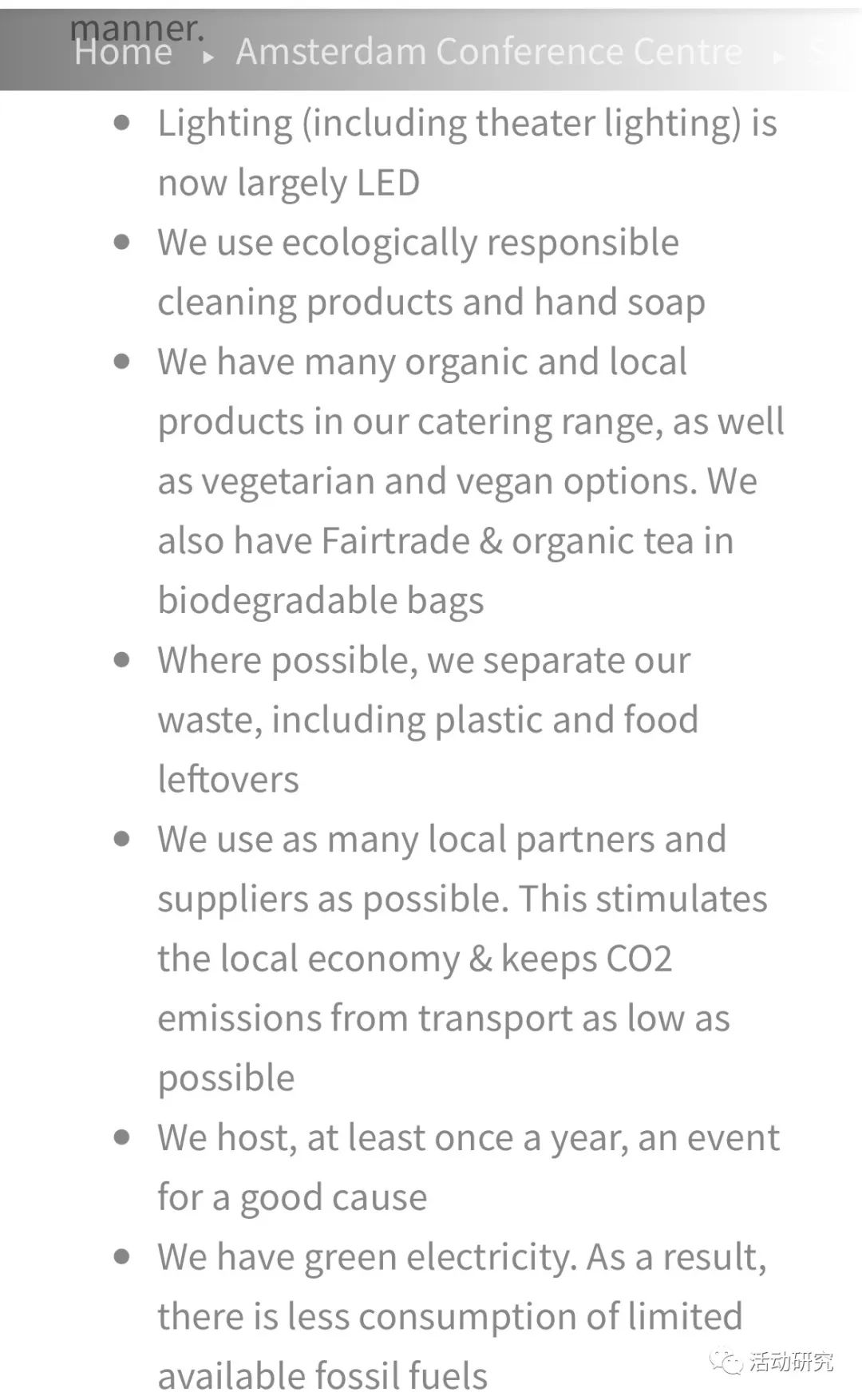 绿色会展是个系统工程,从政府到企业,从城市到个人,都要为此付出努力。阿姆斯特丹一直将green meetings作为特色来打造,政府、CVB、场馆和会展组织者等都有很多创新,其经验值得我们借鉴。