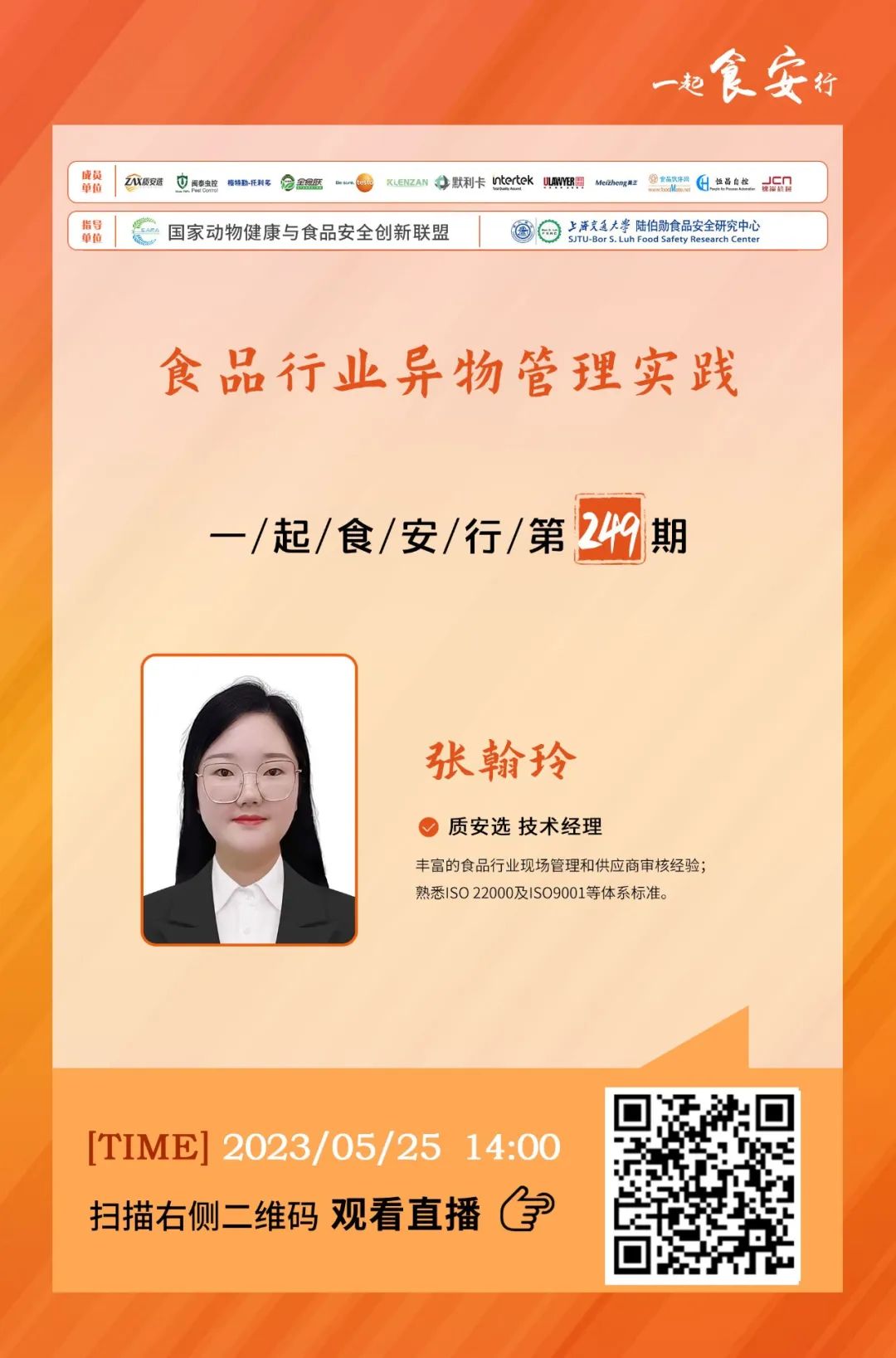 5月25日14:00-15:00,“一起食安行”公益直播课堂将会举办第249期,本期特邀质安选 技术经理——张翰玲,为大家带来关于《食品行业异物管理实践》主题分享,扫描海报二维码即可预约观看: