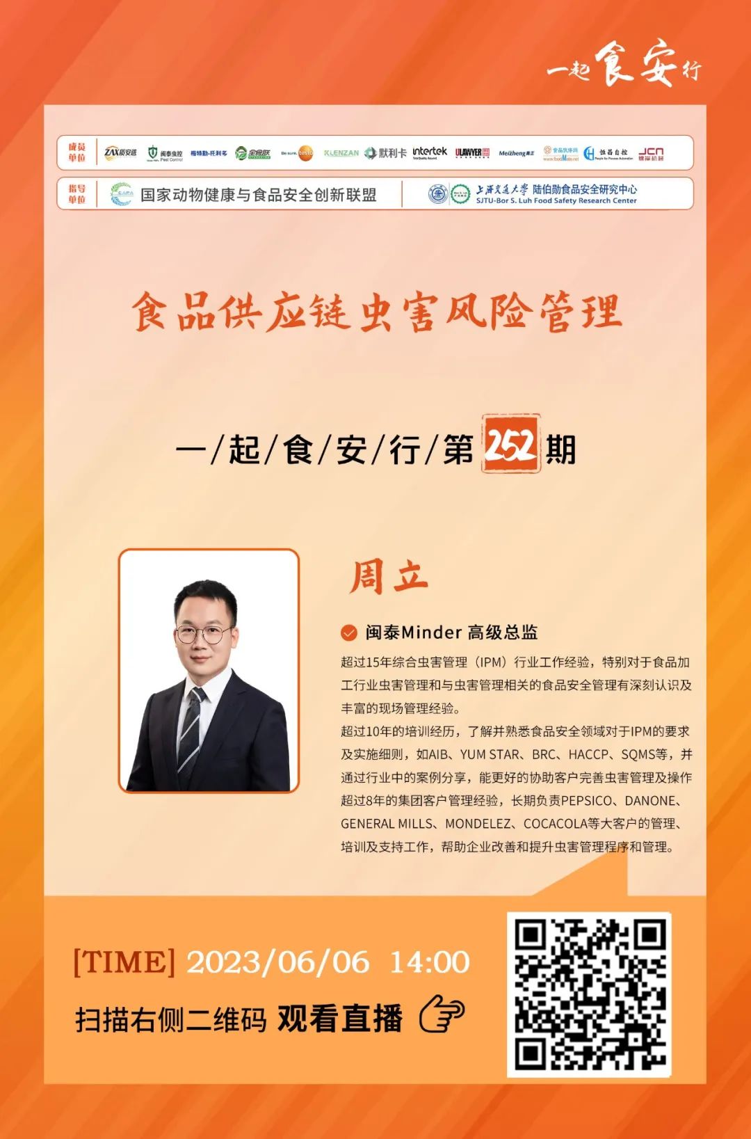 6月6日14:00-15:00,“一起食安行”公益直播课堂将会举办第252期,本期特邀闽泰Minder 高级总监——周立,为大家带来关于《食品供应链虫害风险管理》主题分享,扫描海报二维码即可预约观看: