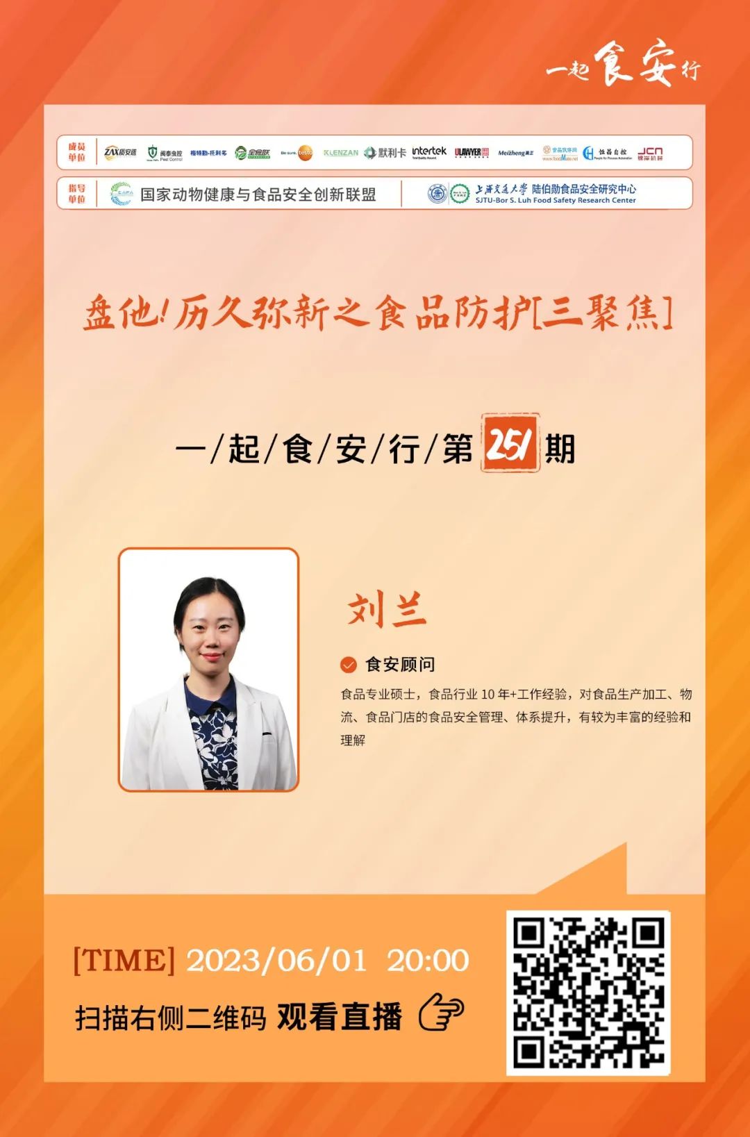 6月1日20:00-21:00,“一起食安行”公益直播课堂将会举办第251期,本期特邀食安顾问——刘兰,为大家带来关于《盘他!历久弥新之食品防护[三聚焦]》主题分享,扫描海报二维码即可预约观看: