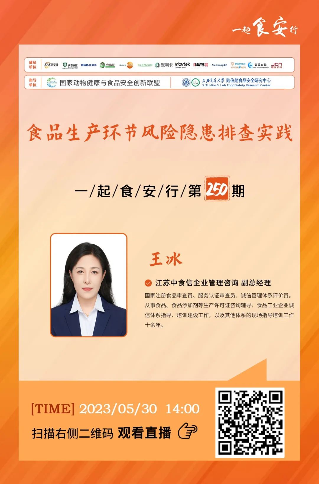 5月30日14:00-15:00,“一起食安行”公益直播课堂将会举办第250期,本期特邀江苏中食信企业管理咨询 副总经理——王冰,为大家带来关于《食品生产环节风险隐患排查实践》主题分享,扫描海报二维码即可预约观看: