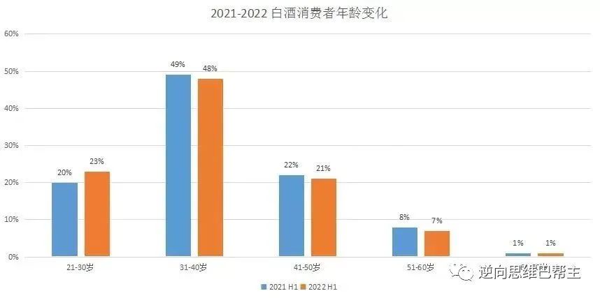 从上图中,我们可以看到喝白酒的绝对主力人群是31-40岁之间的人群,2021年喝白酒的消费人群中,31-40岁这个年龄段的人占比49%,2022年占比48%。