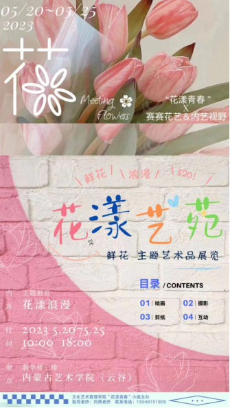 花有约,春不误,春来无事,只为花忙。5月20日,文化艺术管理学院文化产业管理专业2021级同学依托《艺术品经营管理》课程,在云谷校区教学楼三楼举办了“花漾艺苑”课程实践展。展览以爱与浪漫为主题,吸引了众多师生前来参观。