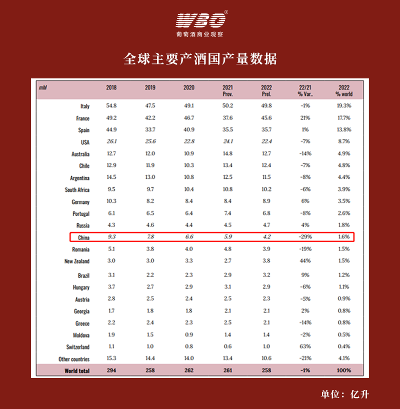 从OIV呈现的整体数据来看,自2018年至今,中国葡萄酒产量从9.3亿升下降为4.2亿升,下降幅度已超过50%,在全球的占比也从3%降为了1.6%。