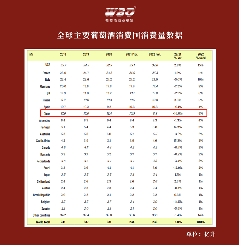 从数据上来看,2022年中国葡萄酒消费量约为8.8亿升,较2021年下降16%,也是全球所有主要葡萄酒消费国下滑幅度最高的国家,并且自2018年以来消费量已整体减半。