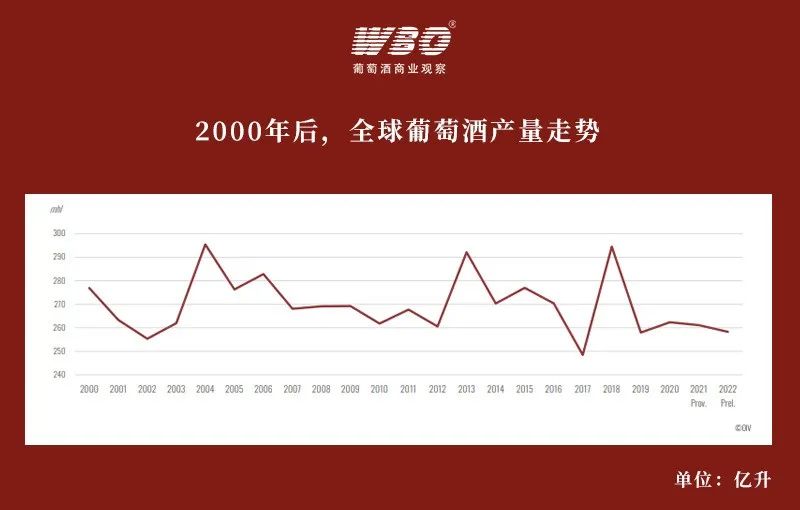 2022年,尽管春季和夏季出现了干旱和热浪,但全球葡萄酒产量(不包括果汁和葡萄汁)仍约为258亿升,与2021年相比仅减少近1%,连续第四年稳定在260亿升左右。