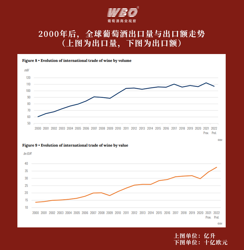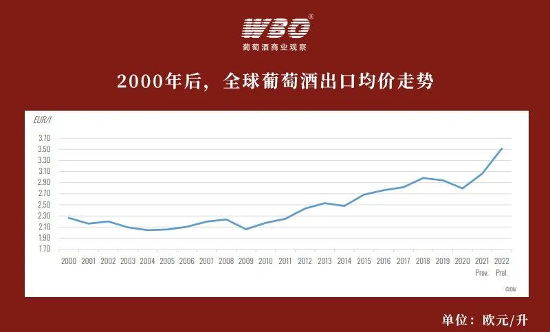 2022年,全球葡萄酒出口量为107亿升,与2021年的历史最高水平相比下降了5%,但与此同时,全球葡萄酒出口额则约为376亿欧元,同比上涨9%,是有史以来的最高记录,这便进一步凸显了葡萄酒出口均价的普遍上涨趋势,涨幅达到了15%,连续两年价格大幅上涨。