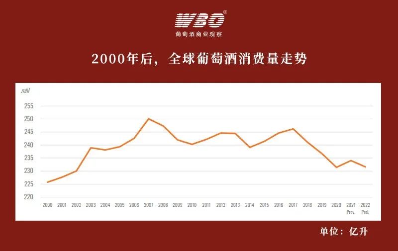 2022年全球葡萄酒消费量约为232亿升,与2021年相比下降1%,算是平稳。