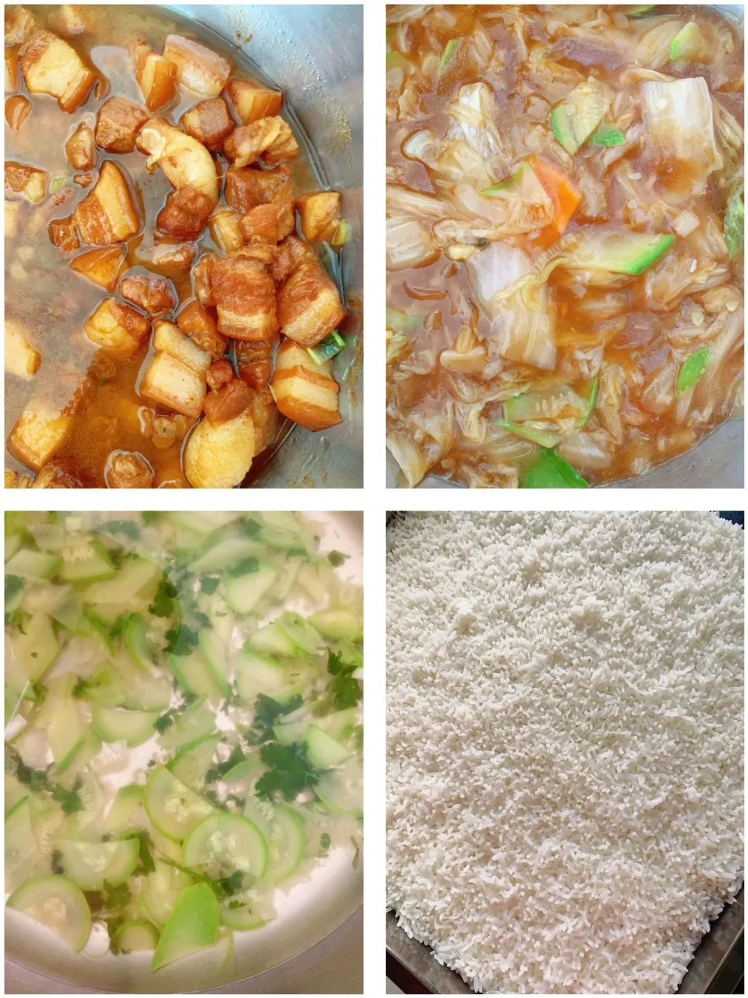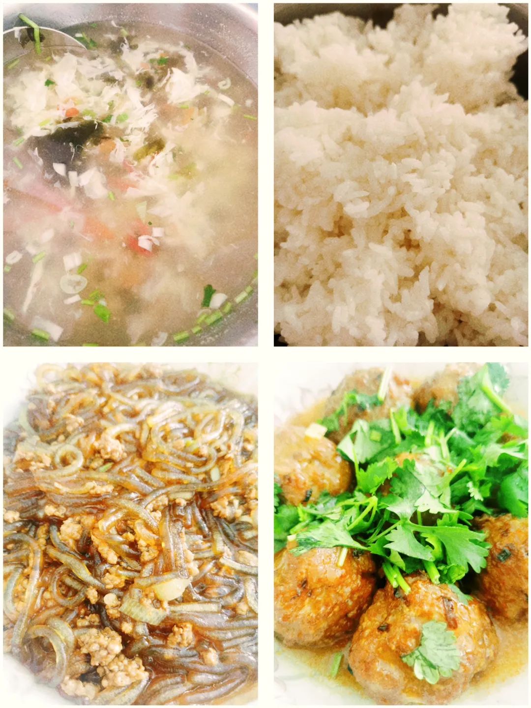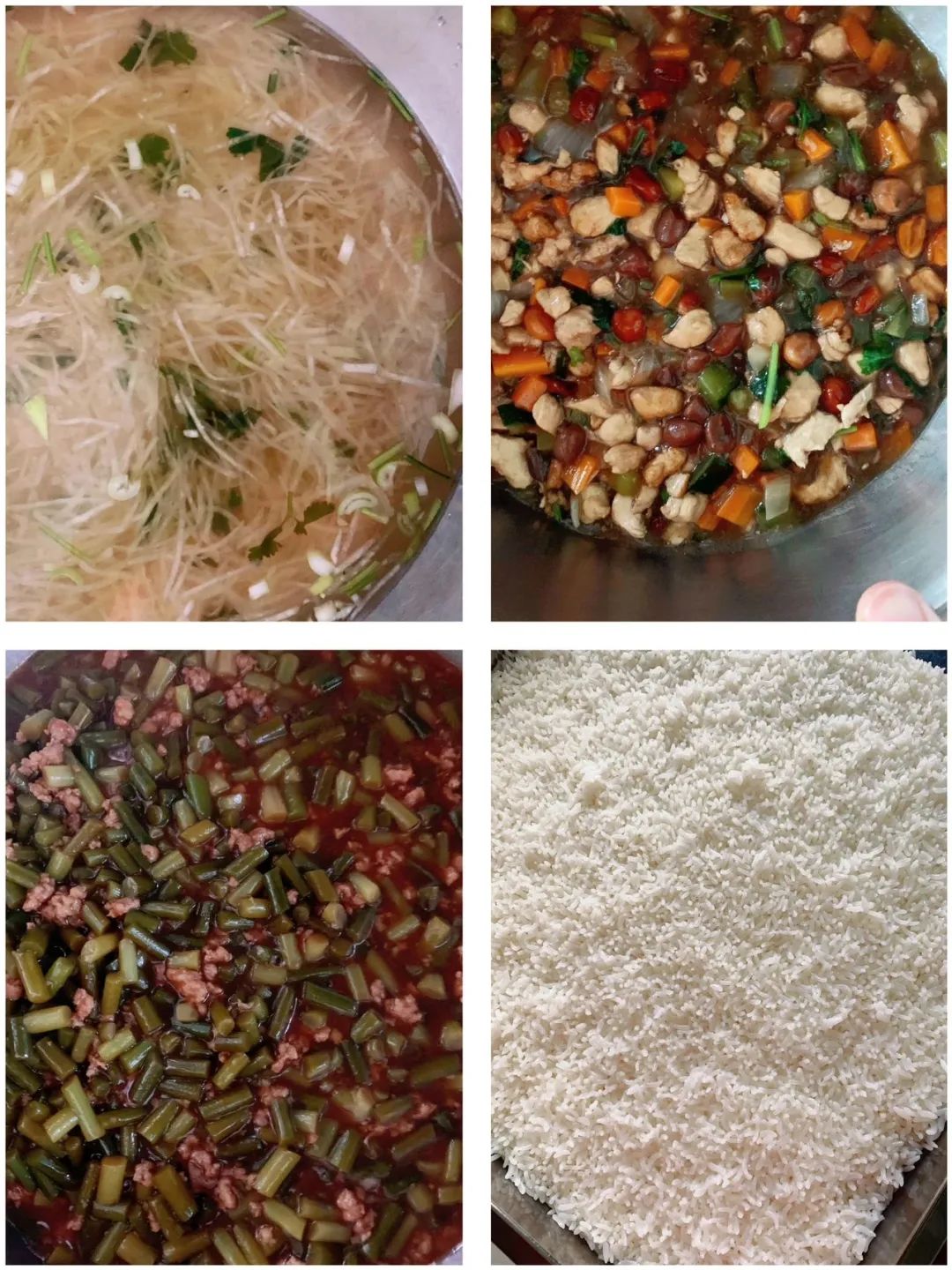 宫保鸡丁、蒜薹炒肉、萝卜汤、米饭
