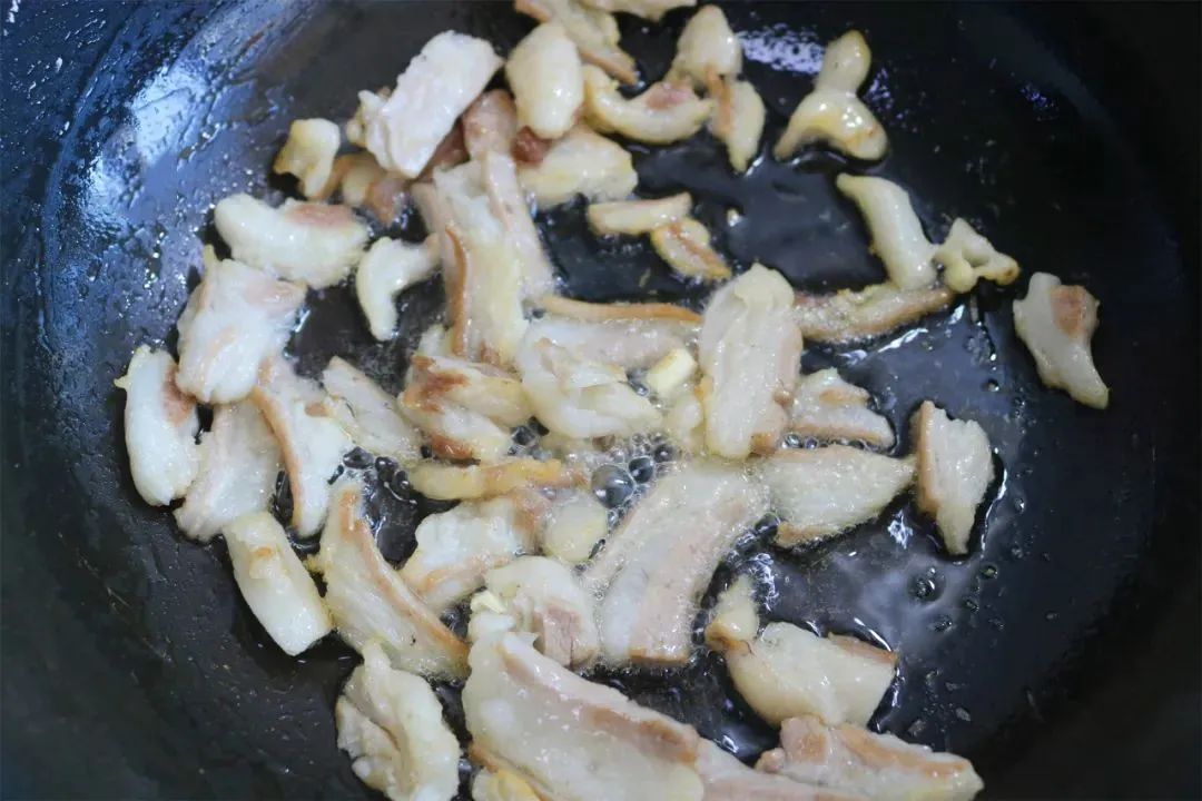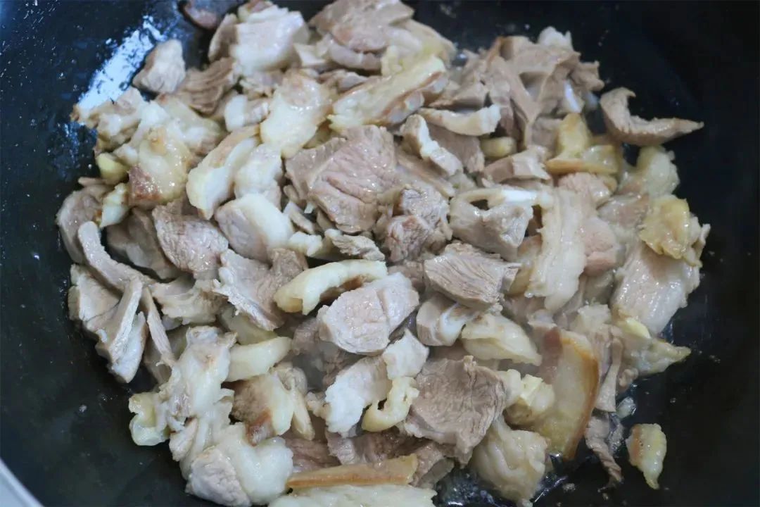 5,再把瘦肉倒进来,转大火翻炒,炒干羊肉表面的水分。炒过的羊肉吃起来更香,也不会腻。