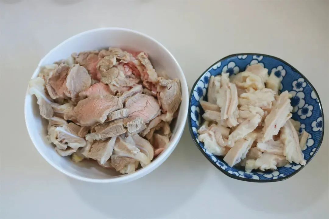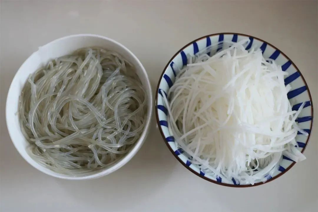 7,白萝卜去皮洗净,切成细丝。粉条温水泡发,淘洗干净后稍微剪短一点。