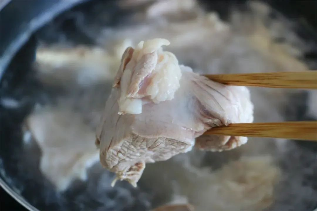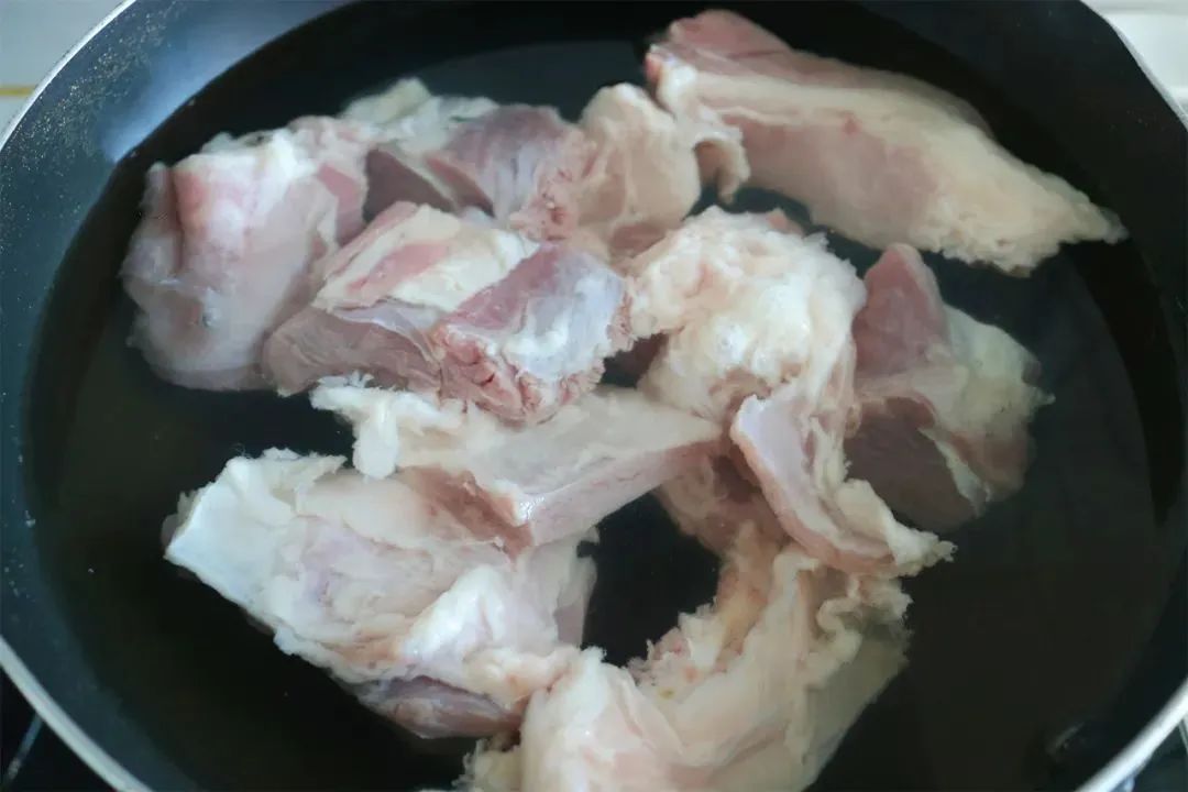 2,捞出的羊肉用凉水淘洗两遍,使温度降下来,同时把羊肉表面的浮沫冲洗干净。