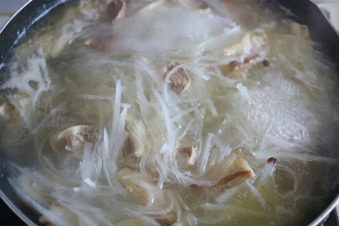 8,羊肉炖熟后放入萝卜丝和粉条,大火煮2分钟左右。再加盐、胡椒粉、鸡精调味就好了。