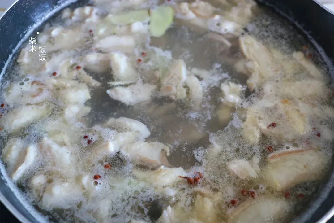 6,接着加入足量的热水,加姜片和少许花椒粒,大火煮开,转小火炖40分钟左右。具体时间看羊肉的状态,炖至软烂即可。