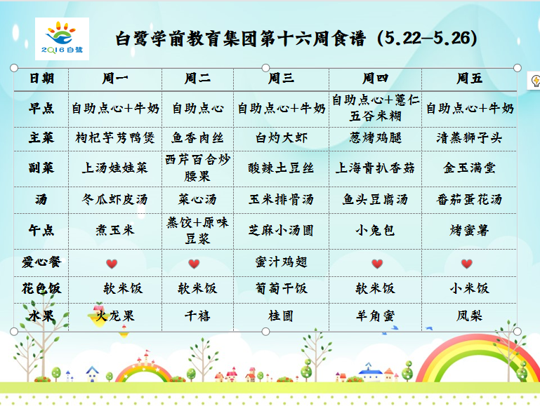 【白鹭·保健】美好“食”光|白鹭学前教育集团第十六周食谱5.22-5.26