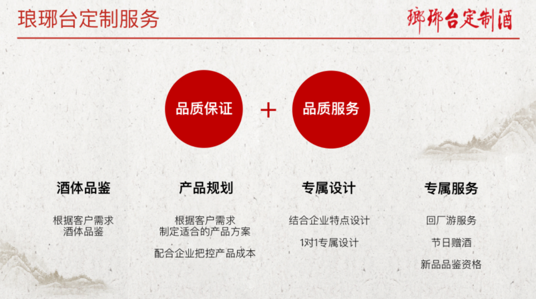 琅琊台定制酒的所有酒体均为非遗传承人匠心酿造、国家品酒大师悉心品评、历经岁月窖藏、市场检验,可谓酒中珍品,出品即精品。