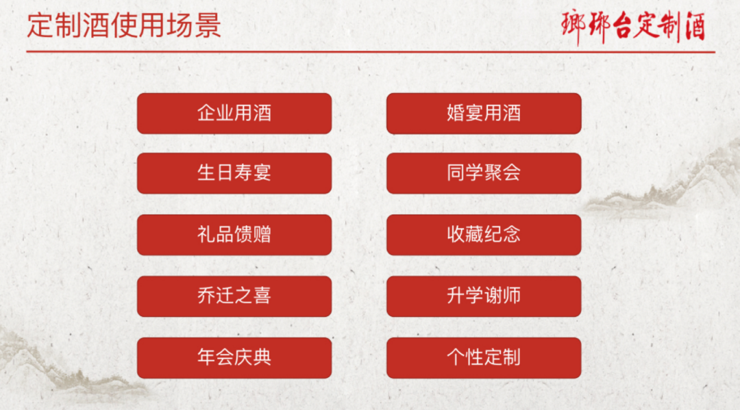 为企业定制的酒瓶和外包装,带有企业专属logo,在招待客户或者做福利时使用,是企业品牌宣传效果的载体,口耳相传,能够更深度、更持续宣传企业品牌。企业定制酒作为福利发给员工,不仅能把企业对员工的关爱表达出来,同时更能增加员工的认同感和凝聚力。