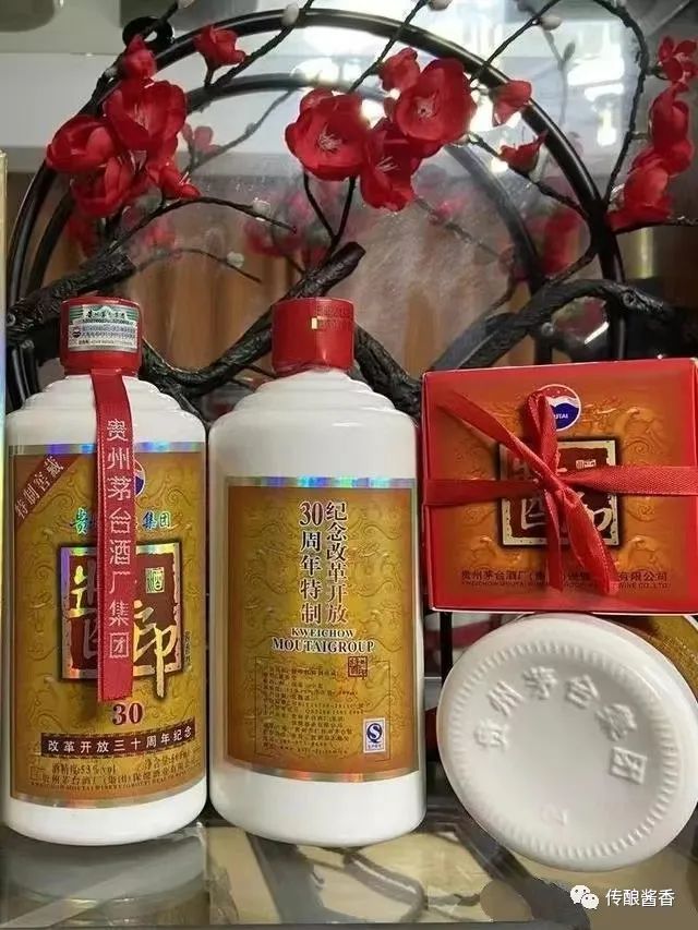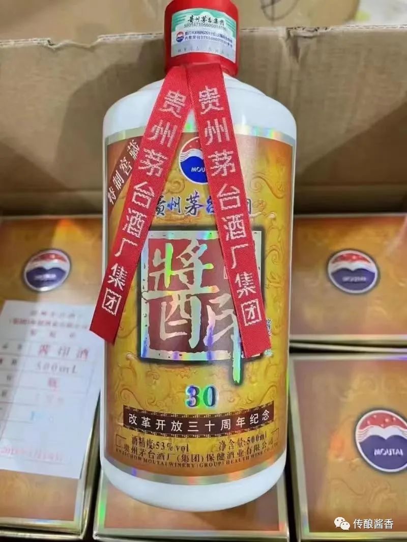 茅台集团 酱印酒(改革开放30周年纪念酒),带有茅台老标的产品不可多得,酱印30周年纪念酒算得上其中之一,与昨天酱印封藏15不同,这款酱印30包装采用普通卡纸盒,属最常规的包装风格,但两者不同的是酱印30每瓶带有两个小酒杯,对于自饮是再好不过的选择。包装上呢比较复古,没有那种高大上的感觉,也不算很精致,毕竟是老一代的酒,酱印30散发出更多的年代与成熟气息。