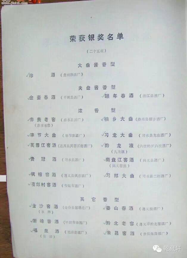 15、珍字牌珍酒(大曲酱香型) 贵州珍酒厂 (因85年底定名为珍酒,按照评比市场年份标准,只能屈居银奖)