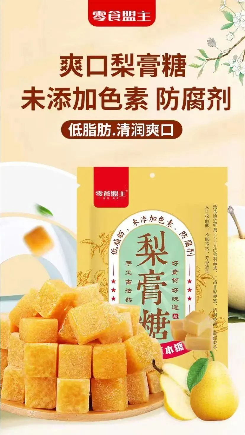 休闲零食:花椒锅巴、三色锅巴、梨膏糖、梨膏棒棒糖、柠檬蜂蜜冰糖、黄冰糖等系列产品。