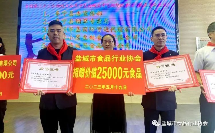 近年来,盐城市食品行业协会积极组织爱心企业家开展关爱弱势群体,彰显社会大爱活动,先后开展助 学、助残、助老、助困送温暖活动10多场次。2021年以来,每年的“助残日”暨“六一儿童节”都组织爱心企业家赴阜宁特殊教育学校开展慰问活动,先后捐赠爱心食品价值7万多元。