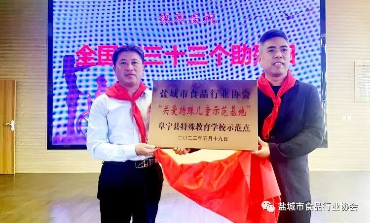 阜宁特殊教育学校负责人对协会领导及爱心企业家表示感谢,并向协会颁发了爱心捐赠证书,并与协会领导共同为盐城市食品行业协会“关爱特殊儿童”示范基地阜宁县特殊教育学校示范点揭牌。