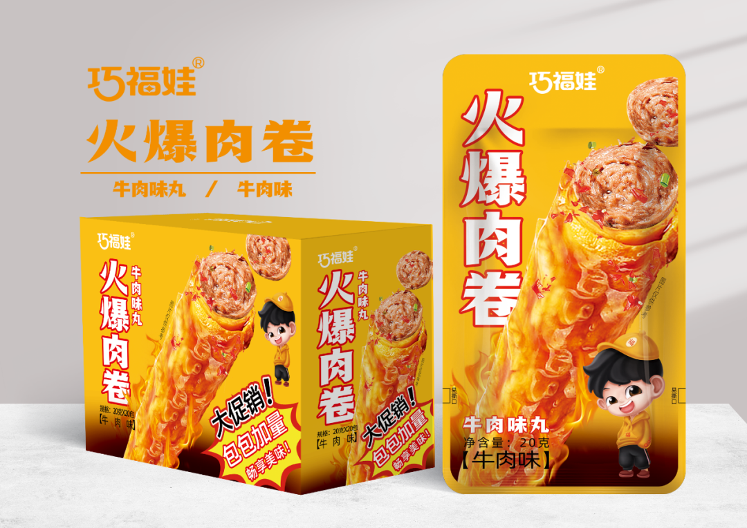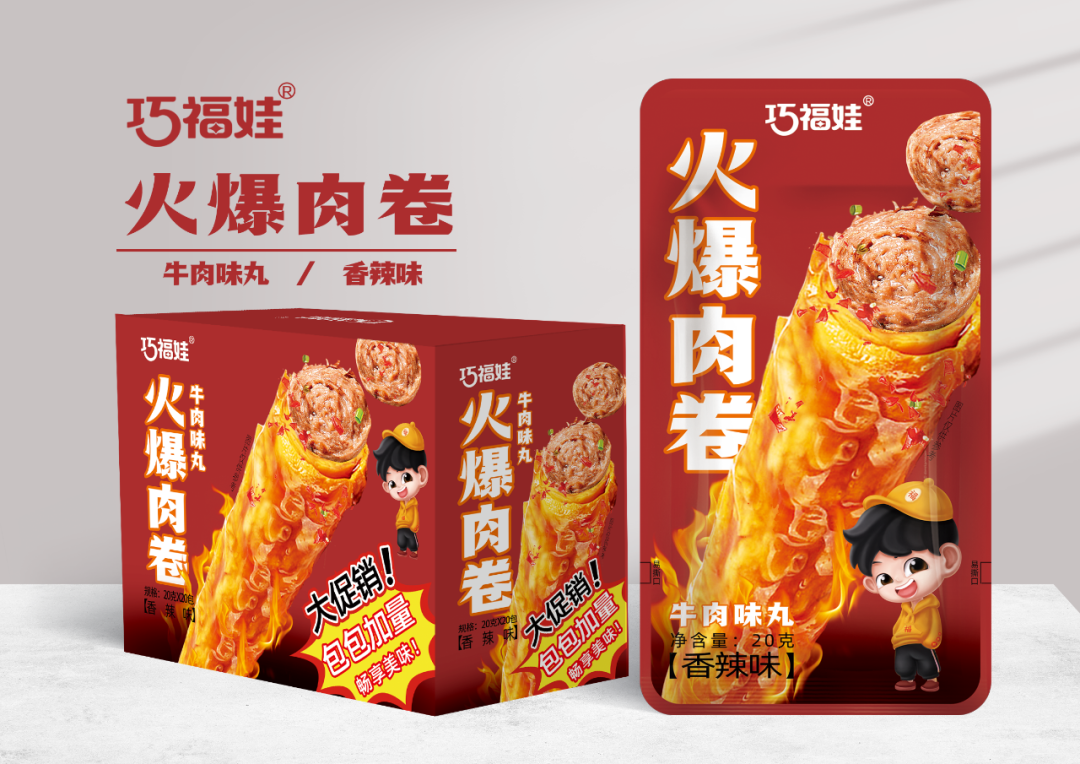 产品介绍:火爆肉卷是巧福娃在2023年5月重点推出来的新品,产品经过了长时间的研发与市场调研,口感与质量得到了非常有效的保障。在新品推广上面,我们决定每一包都加多份量,美味的食品应该要更多一点。现在在全国空白区域进行招商。