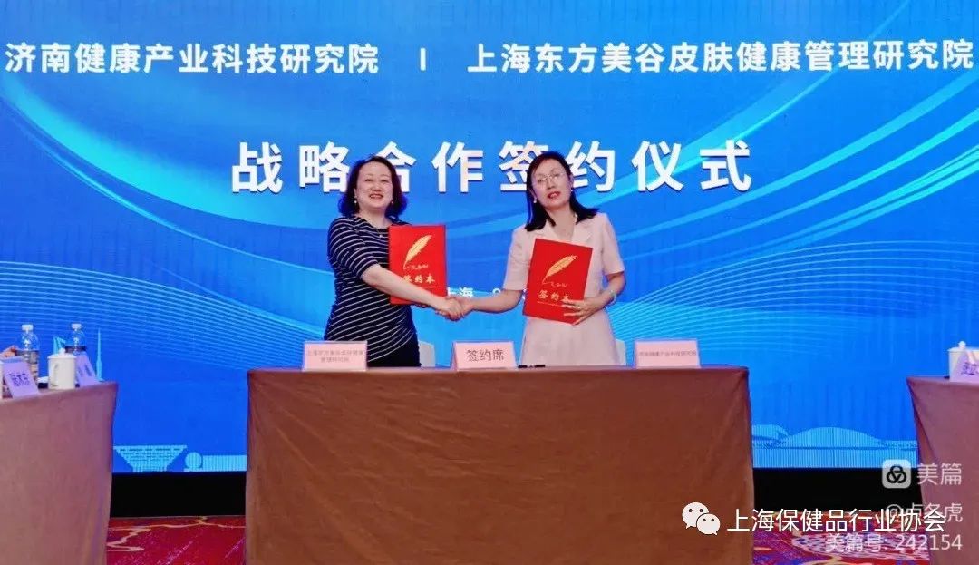 会议最后议程签署战略合作协议,济南健康产业科技研究院与上海东方美谷皮肤健康管理研究院签署共建莱芜分院合作协议,山东省营养保健食品协会、济南健康产业科技研究院理事长赵秋云、上海东方美谷皮肤健康管理研究院李成亮代表签约方上台签约。