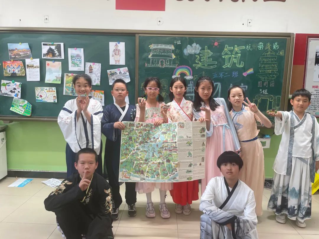 五年三班《地图上的古诗词》,是一种创新的博物馆主题,给同学们带来了全新的体验。五年二班在中国地图上步入了历史的长廊,研究了秦始皇陵兵马俑、杭州西湖、苏州拙政园等地貌特征及风土人情。五年四班同学以“民族”为主题进行了博物馆课程研究。五年五班美食文化博物馆绝对是金地校区最火爆的博物馆之一,从选题到分组筹备,每组同学群策群力,经过一周的筹备工作,正式开馆。五年六班的同学们针对中国建筑六大派系自由成组,在协作中完成了别出心裁的设计创作。