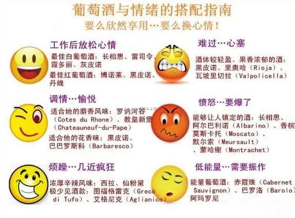 能够让人镇定的酒:长相思、阿尔巴利诺(Albarino)、华帝露(Verdelho)、香槟(Champagne)、莫斯卡托(Moscato)。或者,喝些能够改变你心情的葡萄酒:默尔索(Meursault)、蒙哈榭(Montrachet)白葡萄酒等。