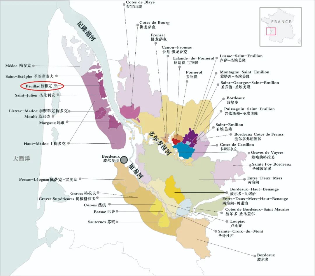 波雅克位于法国波尔多左岸的上梅多克产区,以出产优质的红葡萄酒而著称。在1855年梅多克的分级制度中,共评出四个一级酒庄,分别为:拉菲古堡、拉图酒庄、玛歌酒庄、侯伯王酒庄,再加上1973年由二级酒庄升为一级酒庄的木桐酒庄,总共有五个一级酒庄。而波雅克村就占有其中三个,这也许就是这个名不见经传的小村庄名扬天下的原因。