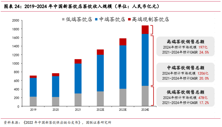 根据弗若斯特沙利文发布的《2022年中国新茶饮供应链白皮书》,中国新茶饮市场已经成长为千亿量级市场,2021年市场规模达1097亿元。根据报告中数据计算,2019-2021年中国新茶饮行业年复合增长率达24.2%,预计到2024年市场规模将增长至1880.7亿元;21-24年CAGR降至19.67%,但相比2021年仍有超70%的市场增长空间。