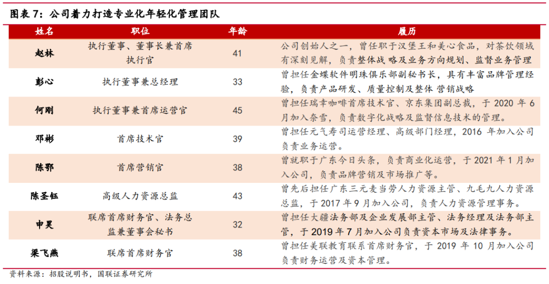 创始人夫妇齐心协力,专业化高管团队助力公司高效运营。赵林拥有近二十年 餐饮行业从业经验,曾于 2009年创立喜年贡茶,对于团队管理、门店运营等方面有 深入见解,而彭心曾担任 IT 产品经理,善于把握品牌调性、产品口味等行业趋势, 主要负责产品开发与市场推广。随后多位行业内专业人员进驻团队,例如瑞幸咖啡 首席技术官何刚于 2020 年 6 月加入奈雪,负责数字化运营。