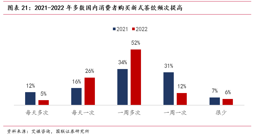 5)随着消费习惯逐渐养成,消费者复购率较高。艾媒咨询调查数据显示,71.2%的消费者会集中在几个固定品牌内进行消费;94%的消费者会每周购买新式茶饮,虽然“每天多次”的消费频次占比有所下降,但“每天一次”及“一周多次”的占比大幅上升,两项合计同比提高28pct,表明多数消费者购买频次在增加。现制茶饮携带着其强烈的社交属性,正逐渐成为常态化消费品类,为行业发展贡献主要力量。
