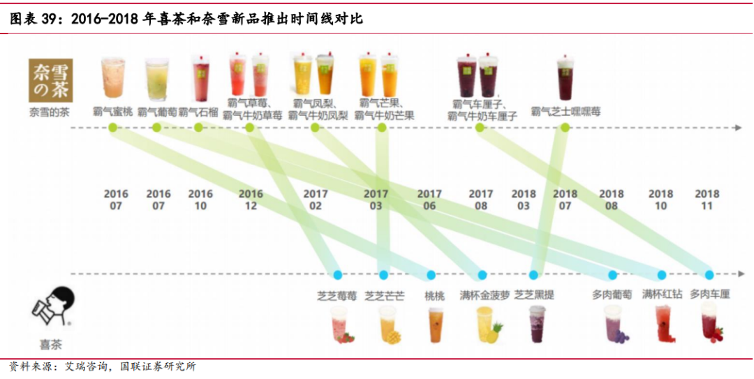 再将时间线拉长至2016-2018年品牌成立之初,同时也是高端茶饮高速发展之时,市场对每一款新品反应程度较高,新品成为推动销售额的重要因素。对比喜茶和奈雪的新品推出时间线,我们发现两大品牌产品线重叠度较高,但奈雪的推出时间普遍早于喜茶。
