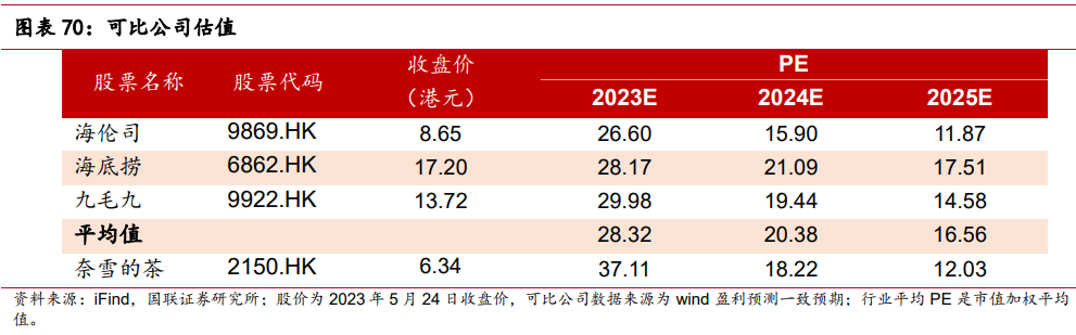 相对估值:我们预测23-25年EPS分别为0.17/0.34/0.57元。目前国内同行业可比公司较少,选取港股连锁餐饮龙头海伦司、海底捞,以及九毛九作为可比标的。目前奈雪还处于快速展店阶段,预计2023年可实现扭亏但多数门店经营尚未稳定,2024年仍处于高速增长轨道,预计到2025年将大致接近海底捞等门店数量较为稳定的餐饮龙头估值水平。