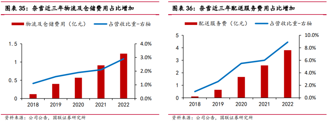 物流费用主要包含配送服务费与物流仓储费两大部分,其中配送服务费指支付给外卖配送服务提供商的费用,2018年-2022年物流配送费分别为1.08/6.44/1.67/2.59/3.81亿元,分别占同期总营收的1%/2.6%/5.5%/6.0%/8.9%,配送费及营收占比的快速增加,主要是疫情期间线上订单激增的缘故。