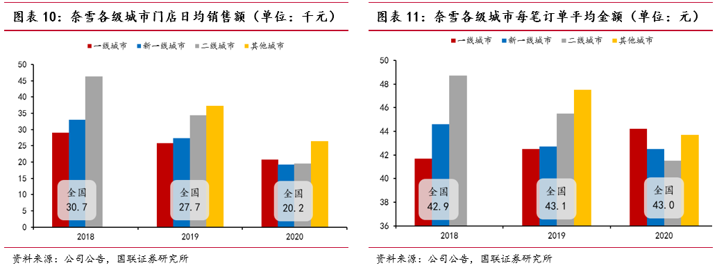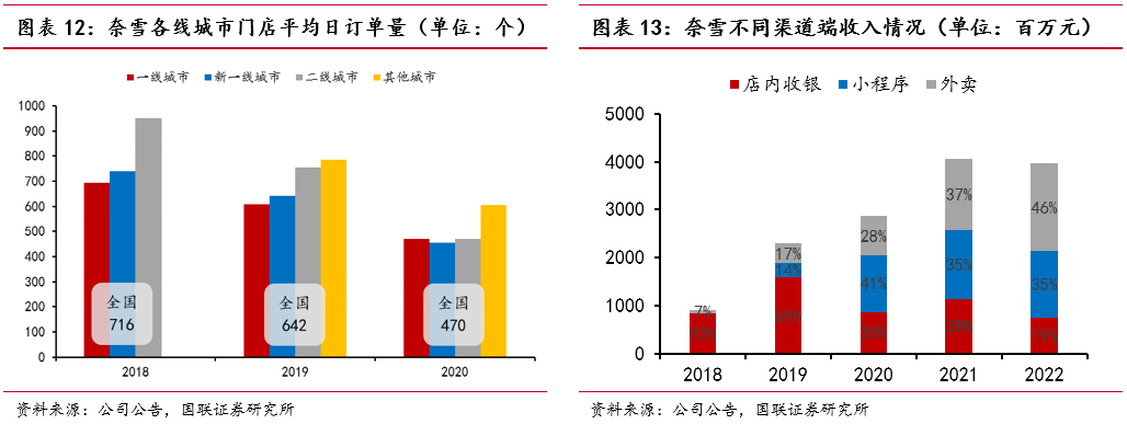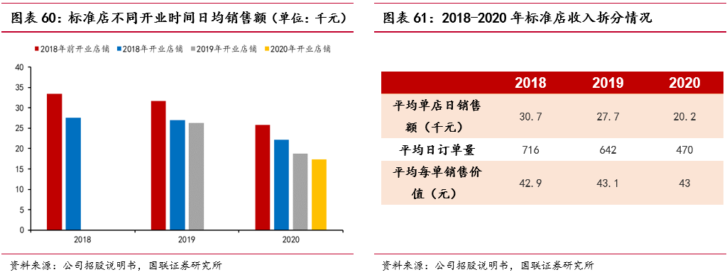 收入端:从奈雪的茶公布的门店数据来看,2021年以前,标准店型新开店日均销售额显著低于成熟门店日均销售额。拆分量价后,平均每单销售金额保持在43元水平,而平均日订单量出现较大下滑,主要原因是受疫情影响短期客流减少,二是新开门店经营时间较短尚未稳定,待门店逐渐步入成熟后整体店效有望提升。