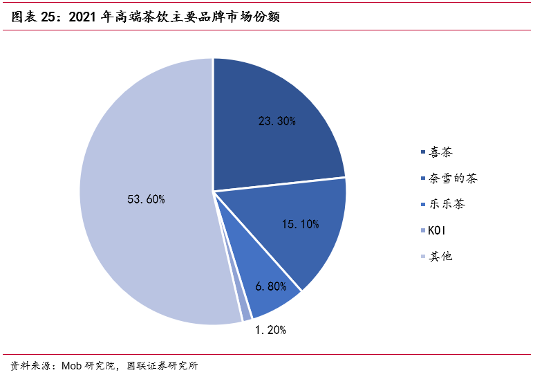 目前高端新式茶饮行业市场集中度已然形成,市场竞争格局逐渐趋于稳定,CR3达45.2%。根据Mob研究院数据,目前高端茶饮市场已形成以喜茶、奈雪的茶为首的双寡头竞争格局, 2021年市场份额分别为23.3%、15.1%。随着资本的不断注入,先发优势的扩大,展店步伐的加快,营销、产品、数字运营、供应链持续完善的综合作用下,现有龙头企业有望逐渐稳固品牌地位,并有望巩固并进一步扩大优势,占据行业核心地位。