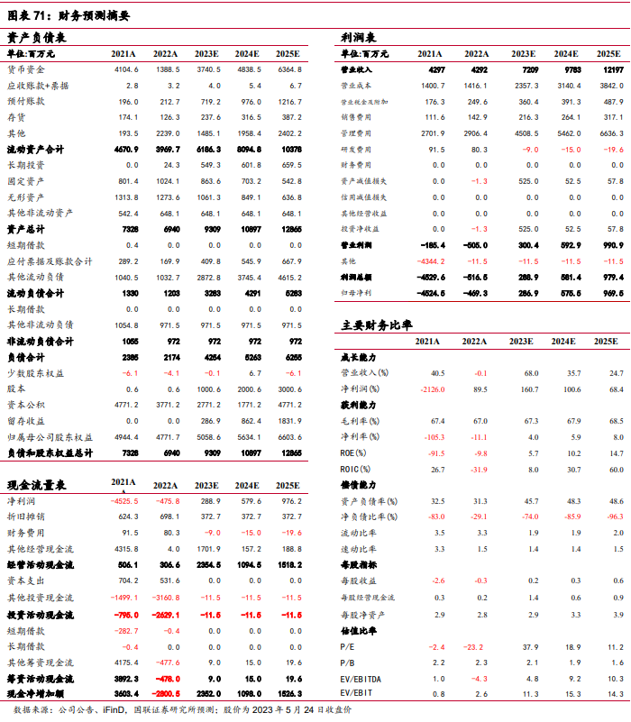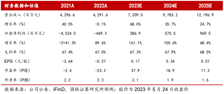 综合上述预测,我们预计公司2023-2025年营业收入分别为72.09/97.83/121.97亿元,分别同比增长68.0%/35.7%/24.7%,对应归母净利润分别为2.87/5.76/9.70亿元,分别同比增长161.1%/100.6%/68.4%。
