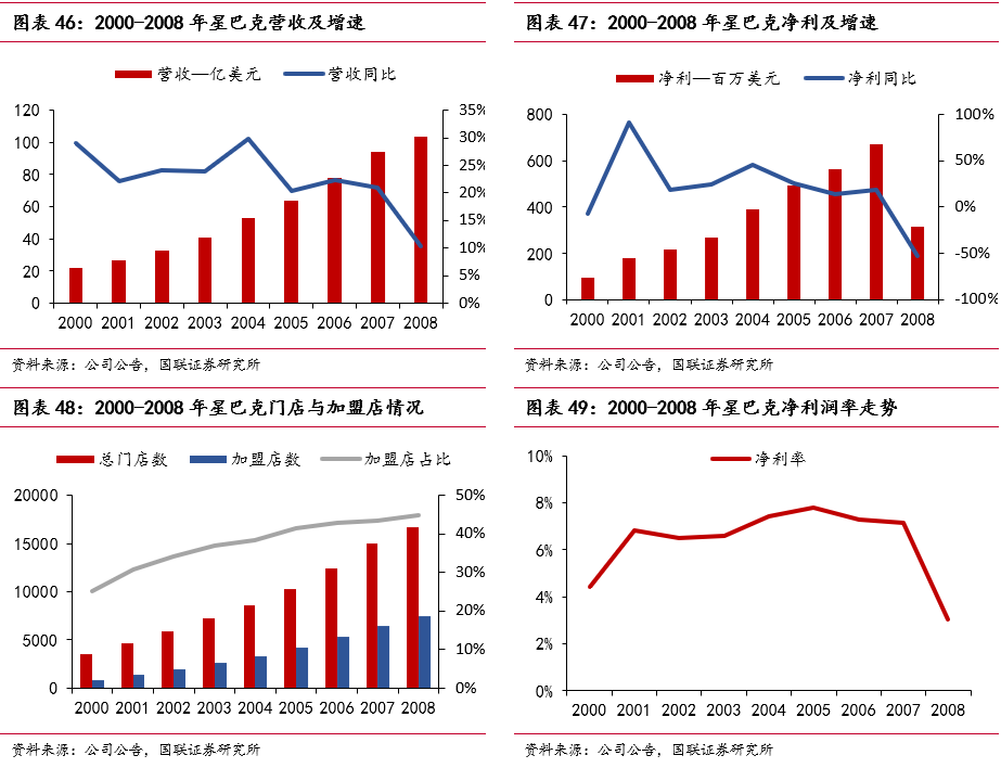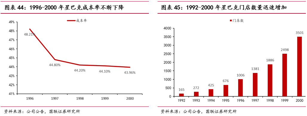 在门店扩张与新品投放的双重驱动因素下,星巴克营收也从1992年的1.03亿美元增长至2000年的21.69亿美元,CAGR为46.33%,净利润同样以46.53%的复合增长率从0.04亿美元增长至0.95亿美元,可见在此阶段门店扩张成为公司营收增长的主要推动因素,规模效应也初步显现,原材料的把控能力与运输效率的提升使得公司成本率从1996年的48.21%下降至2000年的43.96%。