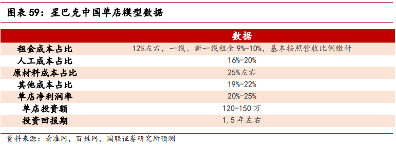 星巴克中国区单店平均月销售额在40-60万元,其中租金成本与营收挂钩是其在费用控制方面的主要抓手,单店净利润率在20%-25%。