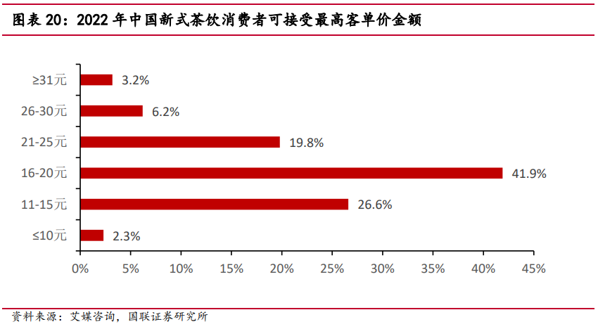 4)外资饮品品牌完成消费者教育。随着星巴克早年进入中国市场打造高端咖啡品牌、占领高线城市消费者心智,通常30元以上的产品定价使星巴克完成了此价格带的消费者教育,产品主流价格在20元以上的现制高端茶饮也逐渐被消费者接受,根据艾媒咨询,新茶饮消费者可接受最高客单价集中在11-25元区间,20元以上占比达29.2%。