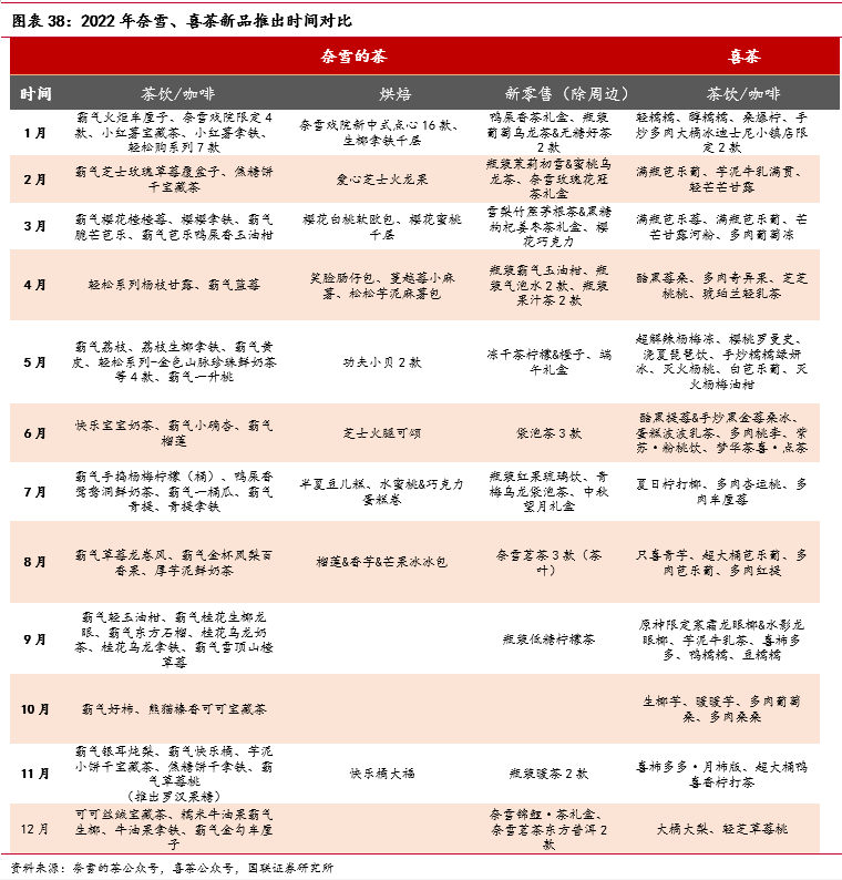 从行业推新对比角度分析,奈雪的茶新品推出速度与节奏均在市场前列。2022年,奈雪的茶共推出91款新品,其中包括58款饮品、33款烘焙产品,平均4天推新一次。同时,22年1月起,为更好地满足疫情下消费者对高性价比产品的需求,头部茶饮品牌相继推出20元以下产品,奈雪推出定价9-19元的“轻松系列”,并承诺每月至少上新一款该系列产品,以触达更多用户。对比喜茶,我们发现奈雪新品发布时间较为平均,且烘焙产品系列比喜茶更为丰富。