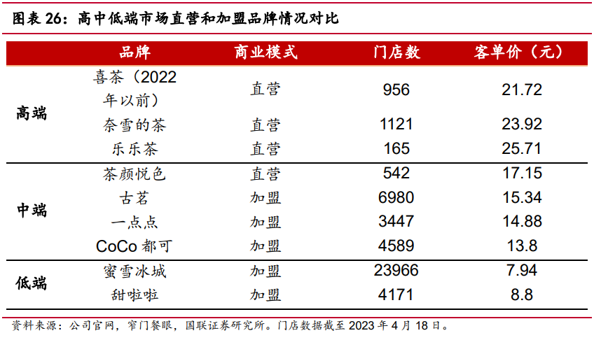 高端茶饮以直营模式为主,中低端茶饮品牌则以加盟方式居多,两种商业模式可谓各有千秋。从下表对比可以较为清晰的看出,高端茶饮品牌为了维持产品品质与服务水平,大多数以直营模式为主。例如喜茶(2022年底开放加盟)、奈雪的茶、乐乐茶(2023年4月宣布开放加盟)均为直营开店,便于总部对门店经营情况的把控,更为注重品牌形象与顾客体验。中端茶饮品牌直营与加盟模式并存,低端茶饮品牌以加盟模式为主。例如一点点、古茗、蜜雪冰城采用加盟方式起到迅速扩店的作用。因此,加盟模式下品牌门店数远高于直营模式下门店数。