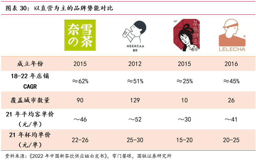 直营模式为品牌调性保驾护航。直营模式为主的品牌在原材料选取、门店设计、品牌服务上拥有更专业和执着的态度,因此前期资金需求较大,扩张速度较慢。但相较于加盟品牌来说,直营模式能够实现持续性的品牌赋能。通过对比直营模式下的主要品牌,我们认为奈雪的茶在客单价、店铺增长率方面具有强大优势。