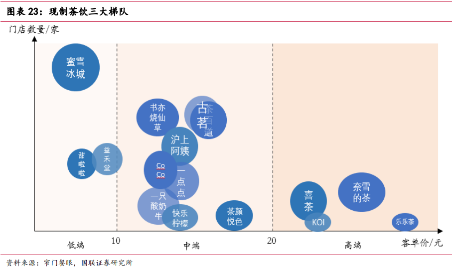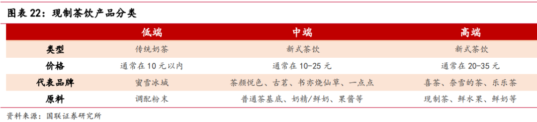 市场上对于现制茶饮低端、中端、高端茶饮的普遍界定为:低端茶饮主要以粉末调制,价格通常在10元内,代表品牌为蜜雪冰城等;中端茶饮主要以普通茶基底、奶精、果酱等为原料,价格通常在10-25元,代表品牌为茶颜悦色、古茗、书亦烧仙草、一点点等;高端茶饮主要以优质茶叶、鲜奶、鲜水果为原料,价格通常在20-35元,代表品牌为喜茶、奈雪的茶、乐乐茶等。其中,低端奶茶通常为粉末冲调的传统奶茶,中高端奶茶则一般为新式茶饮。