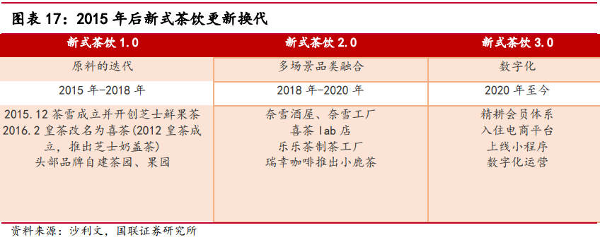 新式茶饮3.0:2020年至今,数字化时代来临,各头部品牌逐步深耕线上会员体系,拓展线上渠道入驻电商平台,各品牌开通小程序功能,以数字化运营为主要特征,体现为全方位的高效率。