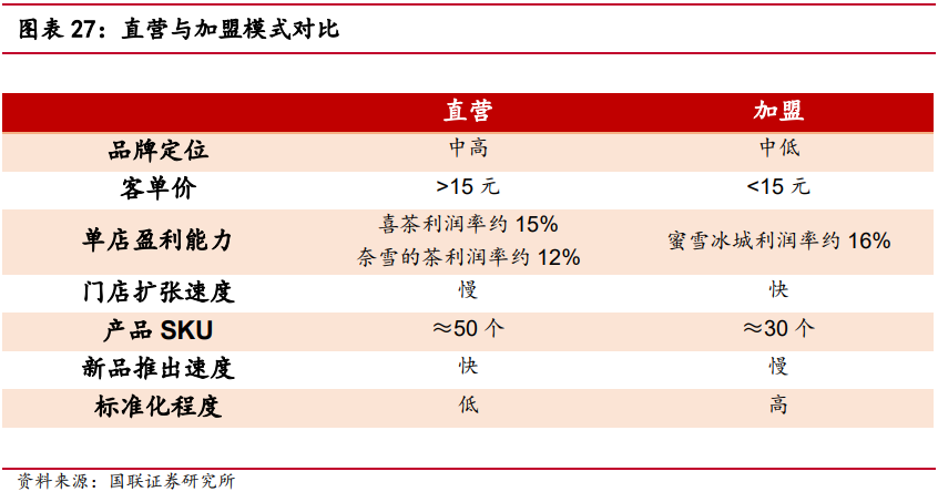 加盟模式:门店迅速加密,规模效应显现,在跑马圈地阶段有利于抢占先机。加盟模式是指公司总部将自身所拥有的商标、产品、技术等以加盟的形式授予合作方使用,而加盟方须支付一定的费用,并在总部统一业务模式下进行经营活动。由于加盟模式成本已原材料为主,门店盈利性较高,投资回报期较短,因此受到企业与投资者的追捧。与直营模式相比,加盟模式以轻资产运营迅速全国化铺开,品牌市场占有率将得到显著提升。但同样,加盟模式下品牌总部对下设加盟店管理能力较弱,产品品控难以长期得到保证,长期来看将对品牌发展形成发展桎梏。
