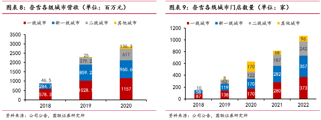 奈雪的茶门店规模快速扩张,新店选址主要集中在一线及新一线城市。自 2017年奈雪开启全国化扩张计划后,公司门店数量迅速从 2018 年的 155 家增加至 2022 年末的 1068 家。截至 2022 年 12 月 31 日数据,奈雪的茶在深圳/上海/广州/武汉/北 京 的 门 店 数 量 分 别 是 146/73/66/57/53 家 , 占 全 国 门 店 总 数 比 重 分 别 为 13.67%/6.18%/6.84%/4.96%/5.34%,门店占比前五的地区均为一线大城市。随着 公司门店可见度提升,品牌知名度逐渐打开,公司也酌情加快了在低线城市的发展 布局,但仍可明显看出高线城市是开店主力战场。